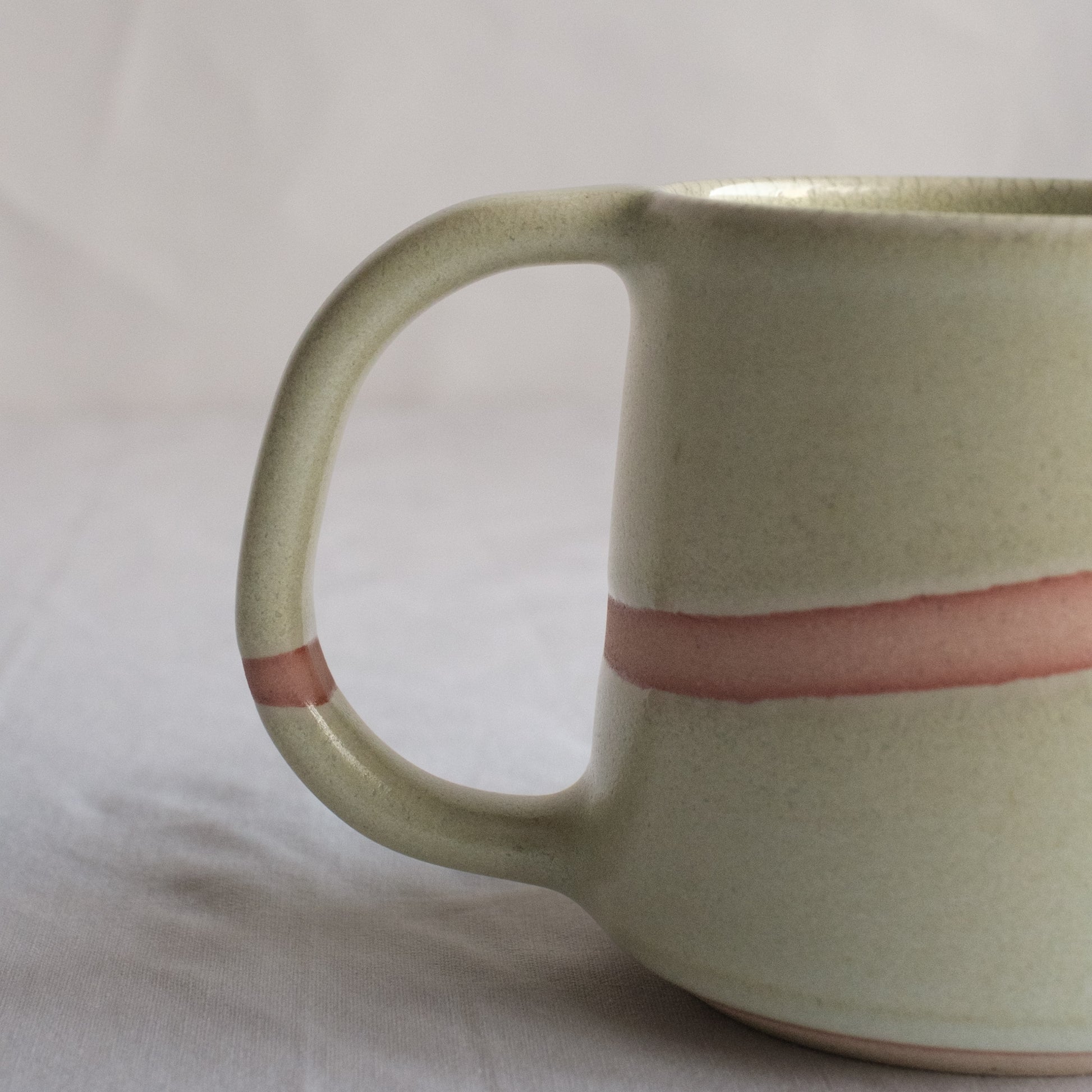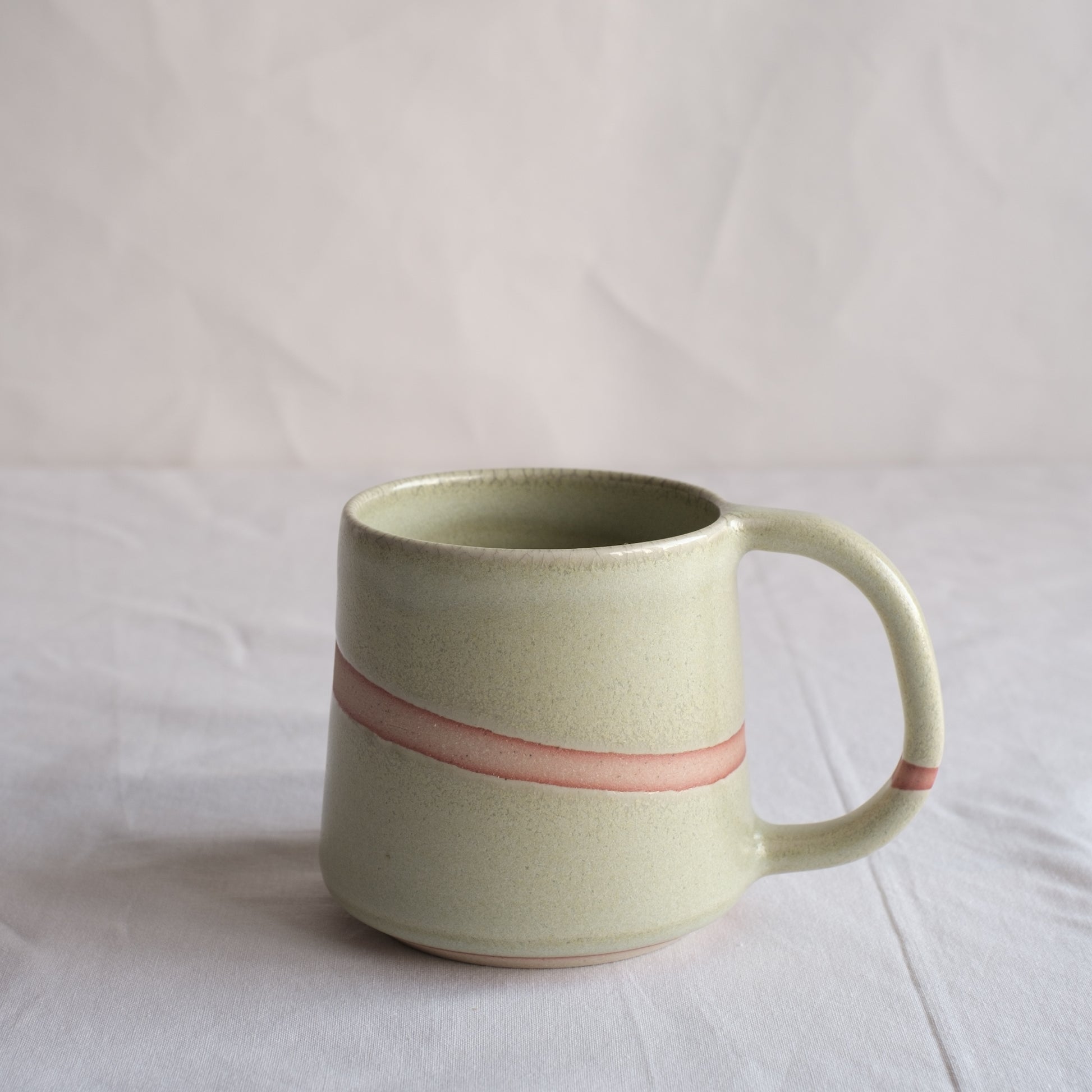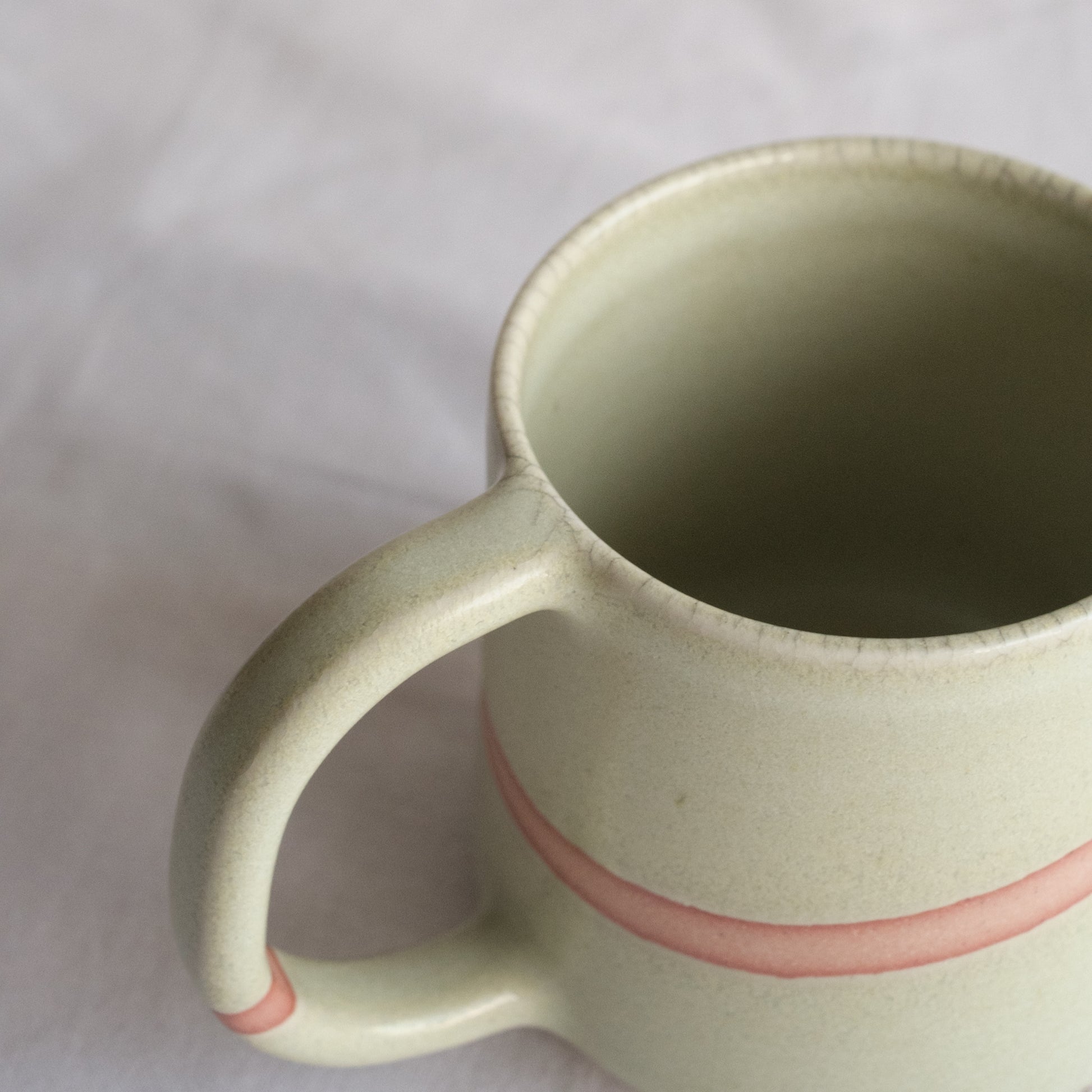 バンド状の薄いコーラルピンクの箇所には釉薬(ゆうやく=表面のガラス質コーティング)がかかっておらず、ざらっとした素地が出ています。