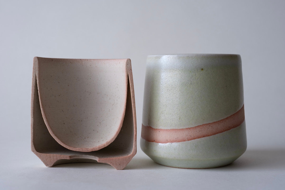 バンド状の薄いコーラルピンクの箇所には釉薬がかかっておらず、ざらっとした素地が出ています。